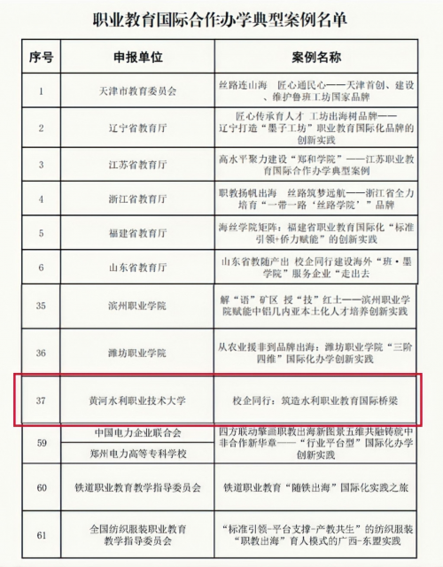 近日,中国教育国际交流协会受教育部职业教育与成人教育司委托,正式公布了“职业教育国际合作办学典型案例”遴选结果。经全国范围征集与专家评审,共遴选产生61个优秀案例。黄河水利职业技术大学申报的《校企同行:筑造水利职业教育国际桥梁》案例成功入选,河南共有3所院校入选。