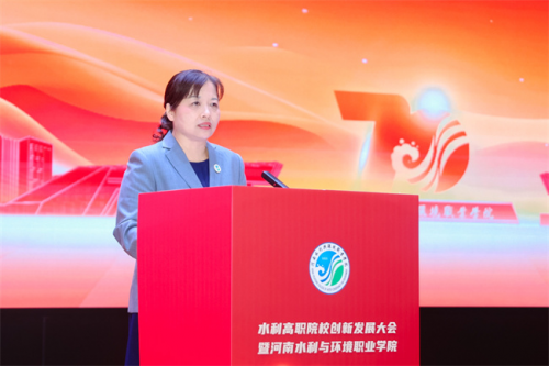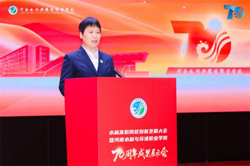 随后,河南水利与环境职业学院校长李志萍发表了题为《深耕水利职教七十载 谱写创新发展新篇章》的工作报告。她系统梳理了学校从“因水而建”的初创期、“依水而兴”的发展期到“循水而进”的跨越期的奋进历程。从百业待兴的1955年到全面振兴的2025年,河南水环学院三迁校址、八易校名,在水利事业和职业教育事业由小变大、由弱变强的历史进程中,走过了初心如磐、薪火相传、求实奋进的70年。